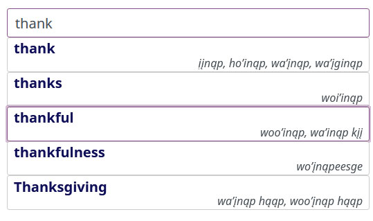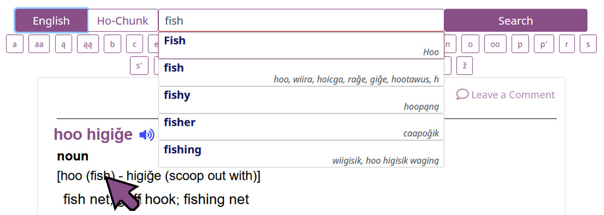 Click on words within an entry to search for those Ho-Chunk or English words within the dictionary. Hit Enter or Click the result to proceed to the entry.
